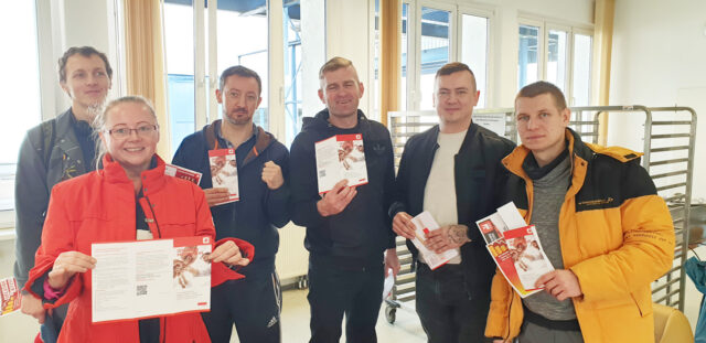 Zuletzt war Roksana Müller unter anderem bei Kolleg*innen in Schwedt, Zittau und Bautzen im Betrieb und verteilte die in polnischer Sprache gedruckten Gewerkschaftsflyer. Die kommen gut an. Viele ihrer polnischen Landsleute wissen es bereits zu schätzen, wenn sie ihnen beim Übersetzen von Verträgen oder Briefen an den Arbeitgeber hilft.