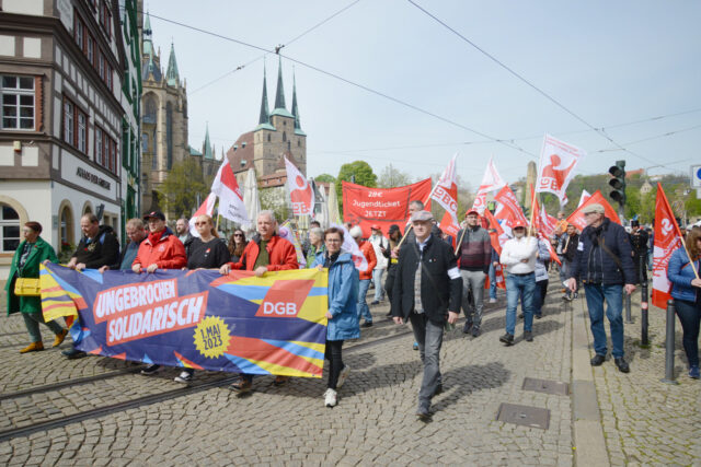 Am Tag der Arbeit sind in vielen Orten in Hessen und Thüringen Gewerkschaftsmitglieder auf die Straße gegangen und haben für die Werte gewerkschaftlicher Arbeit demonstriert. Zum Beispiel in Frankfurt am Main, Darmstadt, Hanau, Kassel, Heringen, Bad Hersfeld, an der Staumauer des Edersees, in Erfurt, Saalfeld, Gera, Jena und Altenburg. Das Motto der vom DGB organisierten Kundgebungen war in diesem Jahr „Ungebrochen solidarisch“.