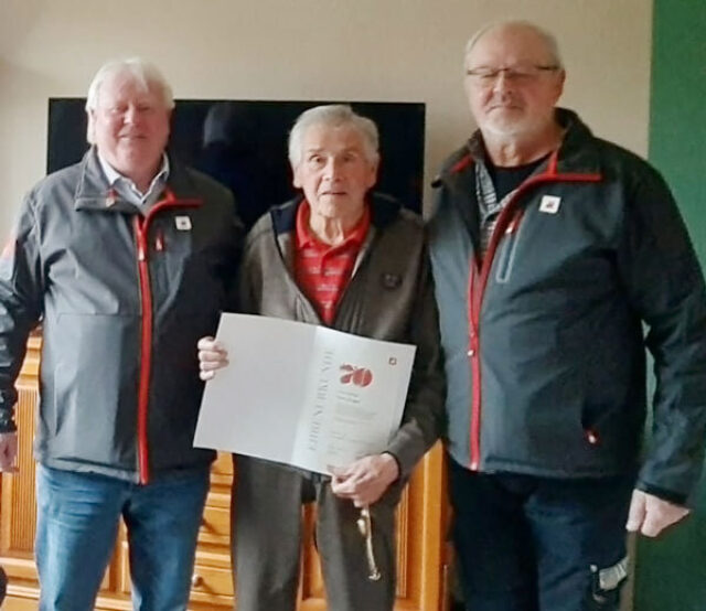 Weil Heinz Krüger nach einem Unfall nicht persönlich zur Jubilarehrung der Ortsgruppe Wilhelmshaven/Friesland erscheinen konnte, sind der Vorsitzende Heinz Laue und Kollege André Scharf 500 Kilometer weit gefahren, um ihn „für seine 70-jährige Verbundenheit mit der Gewerkschaft“ auszuzeichnen.