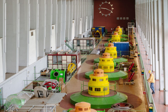 Ortswechsel. Wie bunte Torten stehen acht Maschinen in der Halle von Hohenwarte II. Ihr Boden ist grün, die Mitte gelb, die Spitze orange. Licht fällt durch die Glasfassade im Bauhausstil. Eine riesige Bahnhofsuhr im hinteren Teil der Halle zeigt zehn Uhr. IGBCE-Mitglied Thomas Beyer, gelber Schutzhelm, gelbe Jacke, beugt sich über das Geländer auf der Galerie des Pumpspeicherkraftwerks. Der Ingenieur hat seit seinem 16. Lebensjahr einen Anstellungsvertrag in Hohenwarte, auch wenn er nicht immer vor Ort gearbeitet hat. Mittlerweile ist er bei Vattenfall beschäftigt. Das schwedische Energieunternehmen ist seit 2001 Eigentümer der fünf Stauseen und der zugehörigen Wasserkraftanlagen.