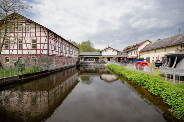 Dort, wo früher die wasserkraftbetriebenen Spinnereianlagen standen, steht nun ein meterlanges Modell der Region. „Von Saalfeld bis kurz vor Blankenstein haben ehemalige Mitarbeiter das Saaletal einschließlich aller Nebenflüsse detailgetreu nachgebildet“, erklärt Schwarz. Zu sehen sind kleine Häuser mit roten Dächern, Stromtrassen und ein dunkelblauer Strich, der über die gesamte Länge des Modells eine Schneise durch hellgrüne und graue Erhebungen schlägt: der frühere Verlauf der Saale.