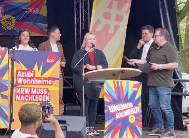 Auf den Kundgebungen in Lünen (Foto oben) und in Recklinghausen (Foto unten) war Birgit Biermann, Mitglied des geschäftsführenden Hauptvorstands der IGBCE, als Hauptrednerin vor Ort. In Lünen führte Biermann die Demonstration an. Die dort anschließende Veranstaltung war wie immer an ein großes Familienfest gekoppelt. In Recklinghausen hat die Maikundgebung wieder im Recklinghäuser Stadtgarten stattgefunden. Nach kurzer Eröffnung durch Birgit Biermann wurde zu einer Diskussionsrunde übergeleitet, an der neben dem IGBCE-Vorstandsmitglied auch Norbert Sperling, Vorsitzender des DGB-Kreisverbands Recklinghausen, und ver.di-Jugendsekretärin Nina Krüger teilnahmen.