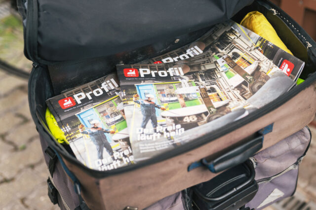 „Zu jeder Adresse kenne ich ein Gesicht“, sagt Annelie Nießen. Die 67-Jährige trägt wie ihr Kollege Gasper in Düren die Profil aus. Rund 250 Exemplare je Ausgabe kommen zunächst per Post zu ihr nach Hause. Den Paketboten kannte Nießen schon, als er noch ein Baby war. Daher hat er einen Schlüssel zu ihrer Wohnung, um die Kartons reinzustellen, wenn sie einmal nicht da ist. Das Verteilen macht Nießen zu Fuß binnen zwei Wochen. Sie ist dann jeden Tag unterwegs – mit Magazinen im Rucksack. Seit sie vor neun Jahren in Rente gegangen ist, liebt sie diese Aufgabe. „Das Wichtigste ist das Gespräch“, sagt Nießen. „Ich sehe nach, dass es allen gut geht.“ Am traurigsten sei, wenn sie feststelle, dass jemand verstorben ist. Dann helfe sie den Hinterbliebenen. Manche würden zum Beispiel gar nicht wissen, dass es im Todesfall Unterstützung von der IGBCE gibt. Sie begleite auch mal ältere Menschen nach Duisburg zur Berufsgenossenschaft. „Ich bin da, bei allen Anliegen“, sagt sie ganz selbstverständlich.