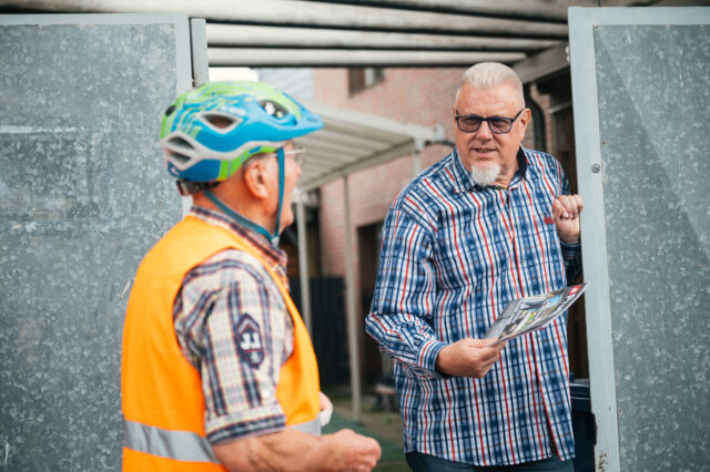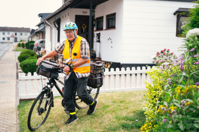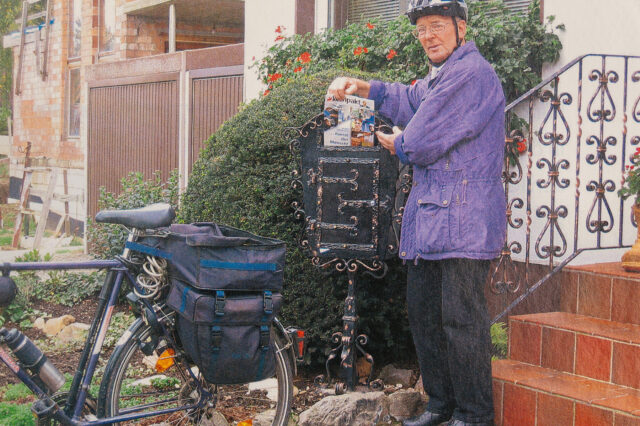 Die Ausstattung von Rudolf Gasper, den hier alle Rudi nennen, ist markant: drei Fahrradtaschen und zwei Trinkflaschen, ein Helm mit Anstecknadeln, eine Sicherheitsweste und zwei reflektierende Hosenklammern. Seit mehr als einem Vierteljahrhundert verteilt der 85-Jährige das IGBCE-Mitgliedermagazin. Seine Route ist insgesamt 40 Kilometer lang und führt ihn durch Arnoldsweiler, Birkesdorf und Düren. An den Haustüren der Mitglieder übergibt er das druckfrische Heft oder er wirft es in den Briefkasten. Für diese Ausgabe sind es gut 200 Exemplare. Wie viel er verteilt, schwankt leicht, je nach aktueller Mitgliederzahl. Diese hoch zu halten, das beschäftigt Rudi Gasper sehr.