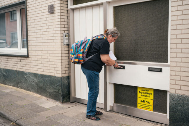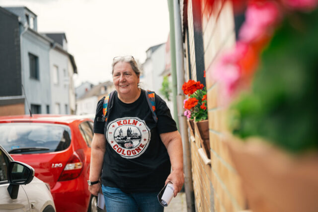 Oft rede man einfach. „Es dauert so lange, wie es dauert“, fügt Nießen hinzu. Dabei gebe es auch mal sensible Situationen. „Manchmal gehe ich nicht ins Haus, denn ich kenne die tratschenden Nachbarinnen und Nachbarn. In solchen Fällen setzen wir uns nach draußen. Dann können alle gucken.“ Nießen ist in Düren geboren, hat nie woanders gelebt. Dennoch fühlt sich als „halbe Kölnerin“, wie sie sagt, denn ihre Mutter stammt von dort. Auf ihrer Strecke ist sie mit den Menschen seit Jahren vertraut – und mit deren Hunden. In zwei Gärten verteilt sie Leckerli, ehe sie sich dem Briefkasten nähert. Manchmal wird sie selbst auf Kaffee und Kuchen eingeladen, wenn sie das Magazin bringt. „Ich liebe es, mit den Leuten zu reden, und gebe alle wichtigen Informationen weiter.“ Magazine zu verteilen, das bedeutet, im Austausch mit Gewerkschaftsmitgliedern vor Ort zu bleiben. Regelmäßige Gartenzaungespräche sorgen für sozialen Zusammenhalt.