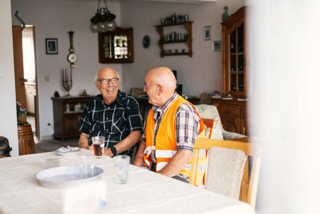 „Manchmal hängt ein Zettelchen für mich am Briefkasten“, erzählt Gasper. Er solle sich melden oder einfach klingeln. In der Gaußstraße bei Werner Weidenfeld, seit 55 Jahren IGBCE-Mitglied, ist so eine vertraute Station. Heute steht die Haustür schon offen, als Gasper sein E‑Bike – den Motor hat er sich zum 80. Geburtstag gegönnt – abstellt. „Rudi, wie war es auf dem Schützenfest?“, fragt ihn der 83-jährige Weidenfeld zur Begrüßung. Die ehemaligen Kollegen haben einander viel zu erzählen. Sie landen nach kurzem Exkurs zur Gartenpflege bei der Geschichte von Feinpapieren. Weidenfeld zeigt Gasper ein mehr als hundert Jahre altes Wasserzeichen aus seinem Fundus. „Dat gibbet heute all nich mehr“, sagen beide immer wieder. Sie arbeiteten zeitweise gemeinsam im Werk Reflex in Düren. Dort wird noch produziert, das Werk in Bergisch Gladbach ist bereits seit Jahren geschlossen. Vor allem das Papier für die Reisepässe im Auftrag der Bundesdruckerei sei ein guter Auftrag für Düren gewesen. „Wir waren eine Perle der Papierindustrie.“