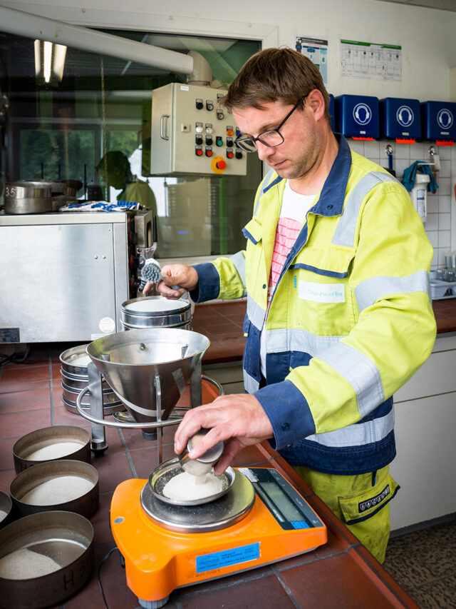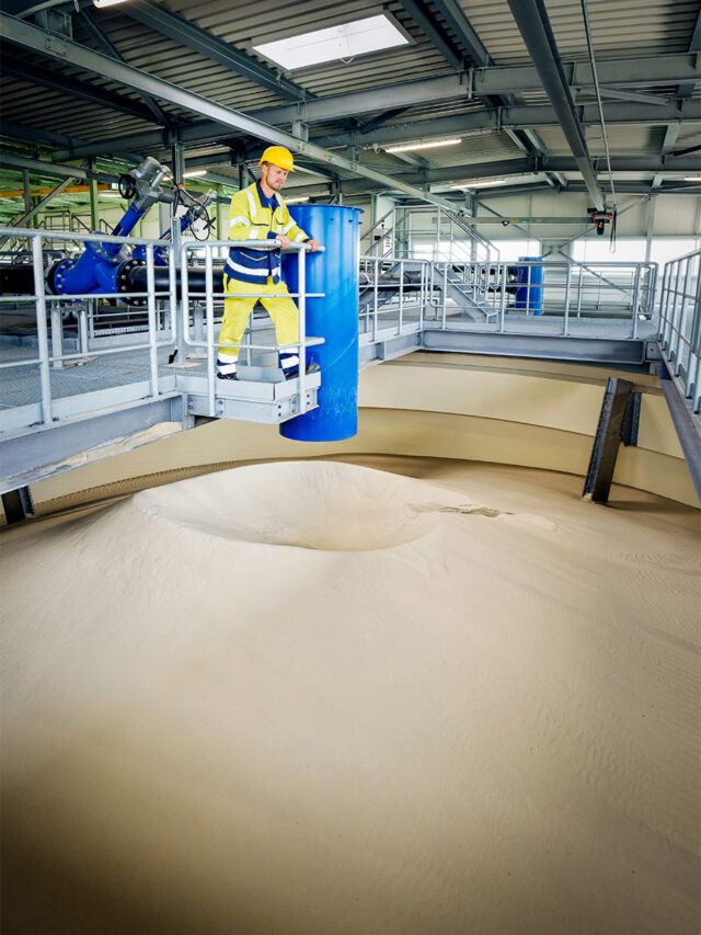 Ob in Glas für Fenster, Autoscheiben oder Behälter, in Putz, Mörtel und Beton oder in den Getrieben von Windrädern und in Fußbodenschichten: Überall findet sich Sand. Auch als sogenannte Formsande in der Gießereiindustrie sind die in Haltern gewonnenen Rohstoffe heiß begehrt. Baggerschiffe bauen den reinen, hellen Quarzsand unter dem Grundwasserspiegel ab. Üblicherweise laufen Schiffe dieser Art mit Diesel – anders die Baggerschiffe in Haltern. Weil die Silberseen in einem Trinkwasserschutzgebiet liegen, werden die Schiffe mit leistungsstarken Elektromotoren betrieben. Haben die Saugbagger ihren Job erledigt, landet der Quarzsand in den Hallen des Werks. In den Aufbereitungsanlagen wird der Sand gewaschen und in verschiedene Korngrößenklassen zerlegt. Für all das braucht es eine Menge Energie.