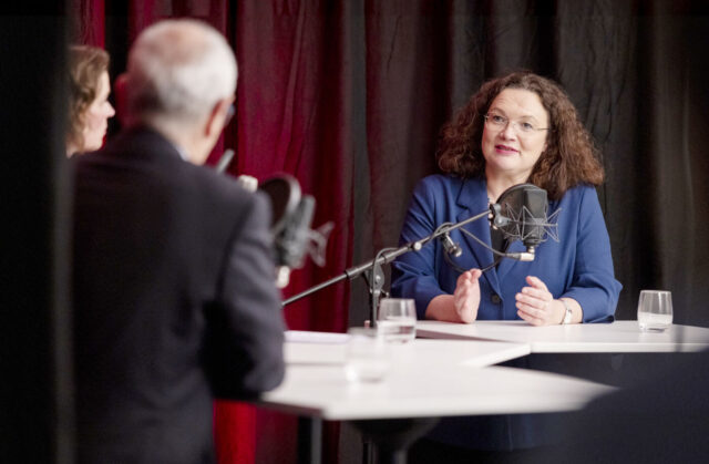 „Bewegung auf allen Seiten nötig“: Andrea Nahles (r.) im Gespräch mit Moderatorin Lea Karrasch und Michael Vassiliadis.