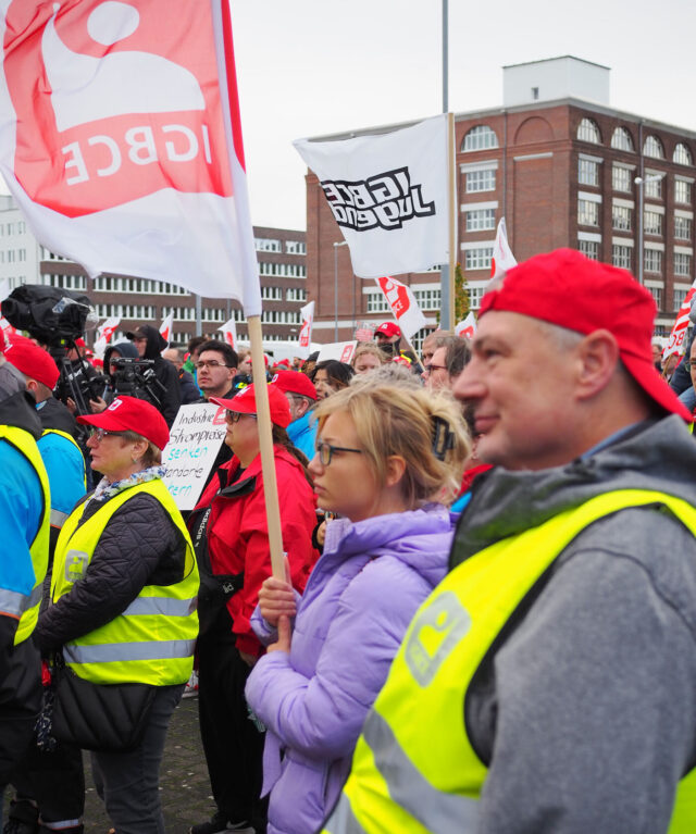 Im Chempark Dormagen zeigten rund 1.700 Mitarbeiterinnen und Mitarbeiter von Arlanxeo Deutschland, Bayer, Covestro, Ineos, Lanxess und Currenta Flagge, im Chempark Uerdingen kamen 2.000 Beschäftigte zusammen, im Chempark Leverkusen waren es rund 3.000 Menschen. Auch die Belegschaften von Dutzenden kleineren und mittleren Betrieben beteiligten sich an den Aktionen. Die IGBCE hatte sich unter anderem der „Allianz pro Brückenstrompreis“ mit DGB, IG Metall und diversen Branchenverbänden angeschlossen, um den Druck auf die Politik für eine befristete Strompreisentlastung zu erhöhen. Ein bundesweiter Aktionstag von IGBCE und IG Metall (siehe Infokasten) am 24. November soll noch einmal Tausende in Duisburg und Berlin auf die Straße bringen, um weiter Druck zu machen.