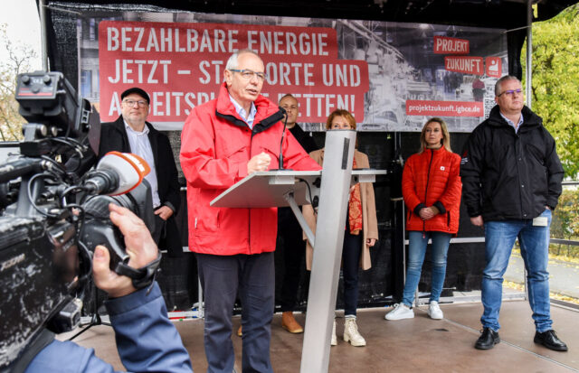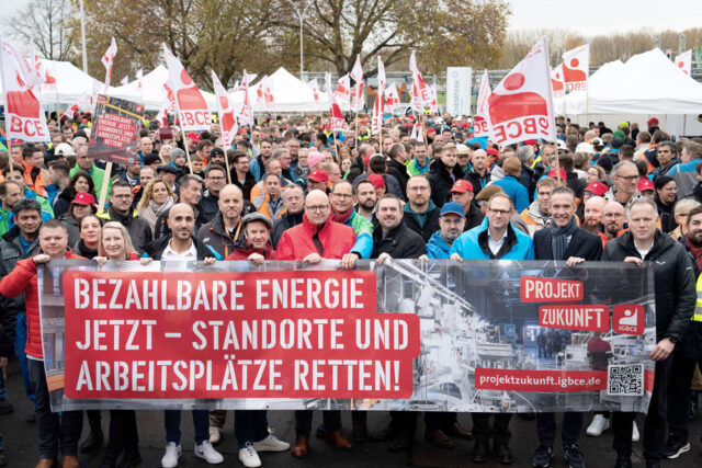 Mehr als 30.000 Beschäftigte aus IGBCE-Betrieben im ganzen Land hatten sich in den vergangenen Wochen bei mehr als 200 Aktionen für einen befristeten Brückenstrompreis für energieintensive Branchen starkgemacht. Allein bei der größten IGBCE-Kundgebung in Ludwigshafen am 8. November gingen mehr als 8.000 BASF-Beschäftigte auf die Straße, ausgerüstet mit Trillerpfeifen, Tröten und Transparenten. Dicht an dicht standen die Beschäftigten vor der Bühne am zentralen Werkstor des weltgrößten Chemiekonzerns. IGBCE-Chef Michael Vassiliadis erklärte in seiner Rede, dass die hohen Strompreise eine Belastung für die ganze Gesellschaft geworden seien. Alle seien davon betroffen, für die energieintensive Industrie sei diese Entwicklung sogar existenzgefährdend.