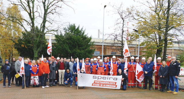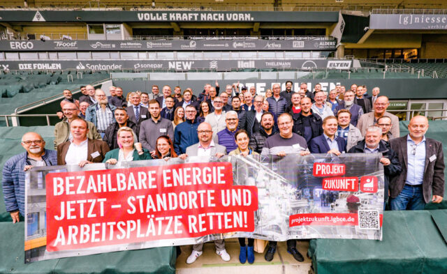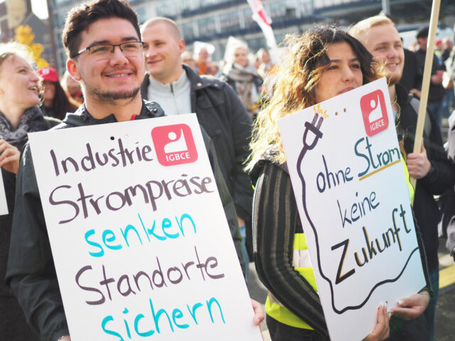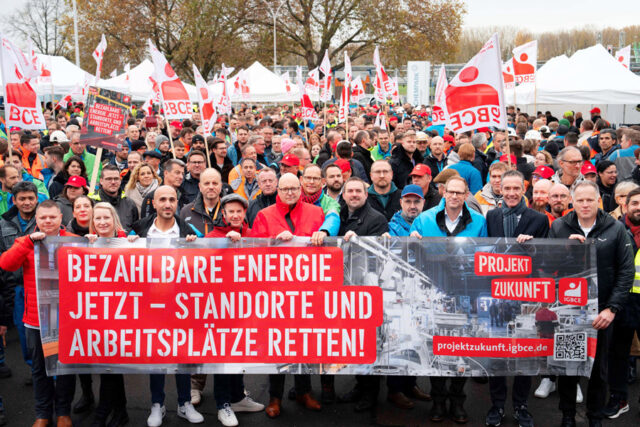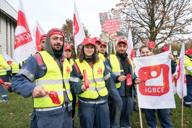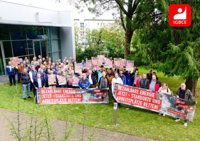 2.000 Kolleginnen und Kollegen demonstrierten am Chempark Uerdingen für den Brückenstrompreis.