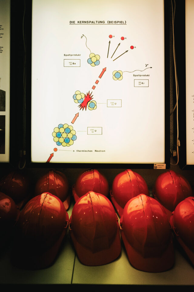 Mit hallenden Schritten geht es über den früheren Fluchtweg ins Innere des AKW. Durch eine massive Stahltür hindurch betreten die Gäste den Geberraum. Edelstahlrohre winden sich von der Decke Richtung Boden, unterbrochen von Hebeln und Messgeräten. Laut Bauplan sollte hier der Druck weitergeleitet werden, mit dem das Wasser die Brennstäbe umspült. Nur wenn der hoch genug ist, verdampft die Flüssigkeit trotz einer Temperatur von 300 Grad Celsius nicht. Das ganze Konstrukt wird daher Druckwasserreaktor genannt. In aktiven Kraftwerken wird die Wärme außerhalb des Reaktors an einen zweiten Wasserkreislauf abgegeben. Der dort entstehende Dampf treibt eine Turbine an, die Strom erzeugt.
