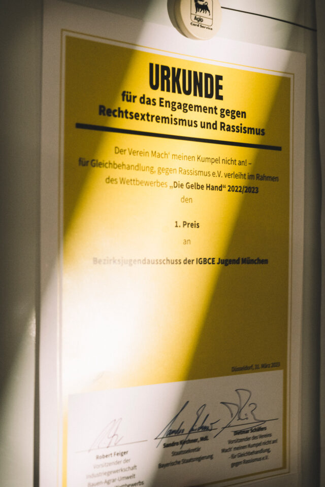 Und ja, auch das Thema Rassismus: Für die siebenteilige Instagram-Story „‚Music supports people‘ – Musik gegen Rassismus und Vorurteile!“ gewann der BJA München den bundesweiten Wettbewerb Die Gelbe Hand. Der Verein Mach’ meinen Kumpel nicht an! – für Gleichbehandlung, gegen Rassismus e. V., der von der DGB-Jugend mitgegründet wurde, richtet ihn seit 2005 aus.