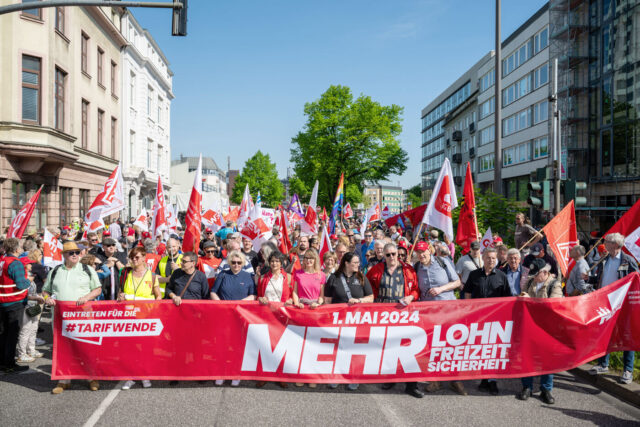 Mitgliederzuwachs der Gewerkschaften zeigte sich auch an hoher Beteiligung: In Hamburg waren 8.000 Menschen auf der Straße.