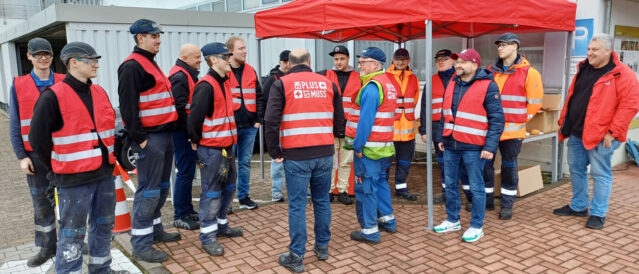Von oben: Bei Tarifaktionen vor der Papier- und Kartonfabrik Varel (oben), bei Sappi Alfeld (Mitte) und bei Steinbeis in Glücksburg (unten) stellten sich die Beschäftigten hinter die Forderungen ihrer Tarifkommission. IGBCE-Landesbezirksleiter Ralf Becker informierte in Varel über den Verhandlungsstand.