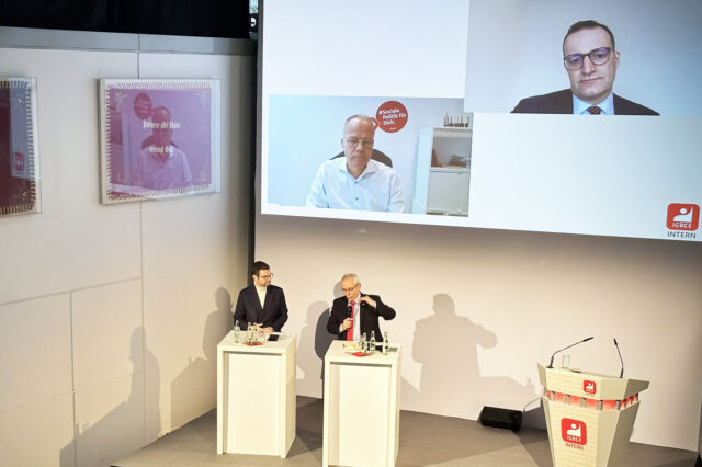 Das Wahl-Extra des Kompass-Talks in der Hauptverwaltung der IGBCE: Auf der Bühne sprachen IGBCE-Vorsitzender Michael Vassiliadis und Marco Buschmann (FDP) mit Matthias Miersch (SPD) und Jens Spahn (CDU), die per Stream zugeschaltet waren.