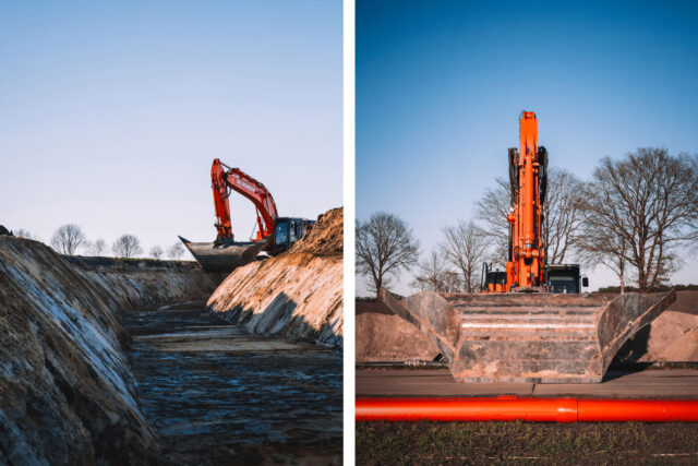 Mit einem eleganten Schwung hebt sich die dreieckig geformte Schaufel des Baggers in den strahlend blauen Himmel, senkt sich ab und zieht kraftvoll durch den Sand. Wieder und wieder hebt sich die extra für das Projekt angefertigte Schaufel, senkt sich, zieht Sand heran, Meter um Meter entsteht so ein exakter Graben mit leicht geneigten Seitenwänden, oben vier Meter breit, unten rund 2,50 Meter, bald schon können hier Kabel verlegt werden.