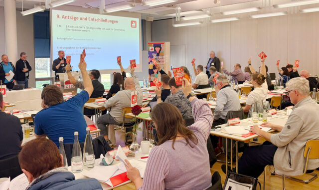 Im Bezirk Ulm stimmten sechzig Delegierte über 15 Anträge ab. Darin ging es unter anderem um eine abschlagsfreie Rente nach 45 Beitragsjahren, erhöhtes Elterngeld, die Abschaffung der sachgrundlosen Befristung und das Recht auf mobiles Arbeiten. Gewählt wurde auch. Neben Delegierten für die Landeskonferenz und den Gewerkschaftskongress im Oktober wurde der Bezirksvorstand neu bestimmt. In diesem sitzen jetzt wieder 14 Vertreterinnen und Vertreter aus den wichtigsten Betrieben und Branchen im Bezirk Ulm sowie den Personengruppen Frauen, Jugend und der Ortsgruppe Göppingen/Eislingen.