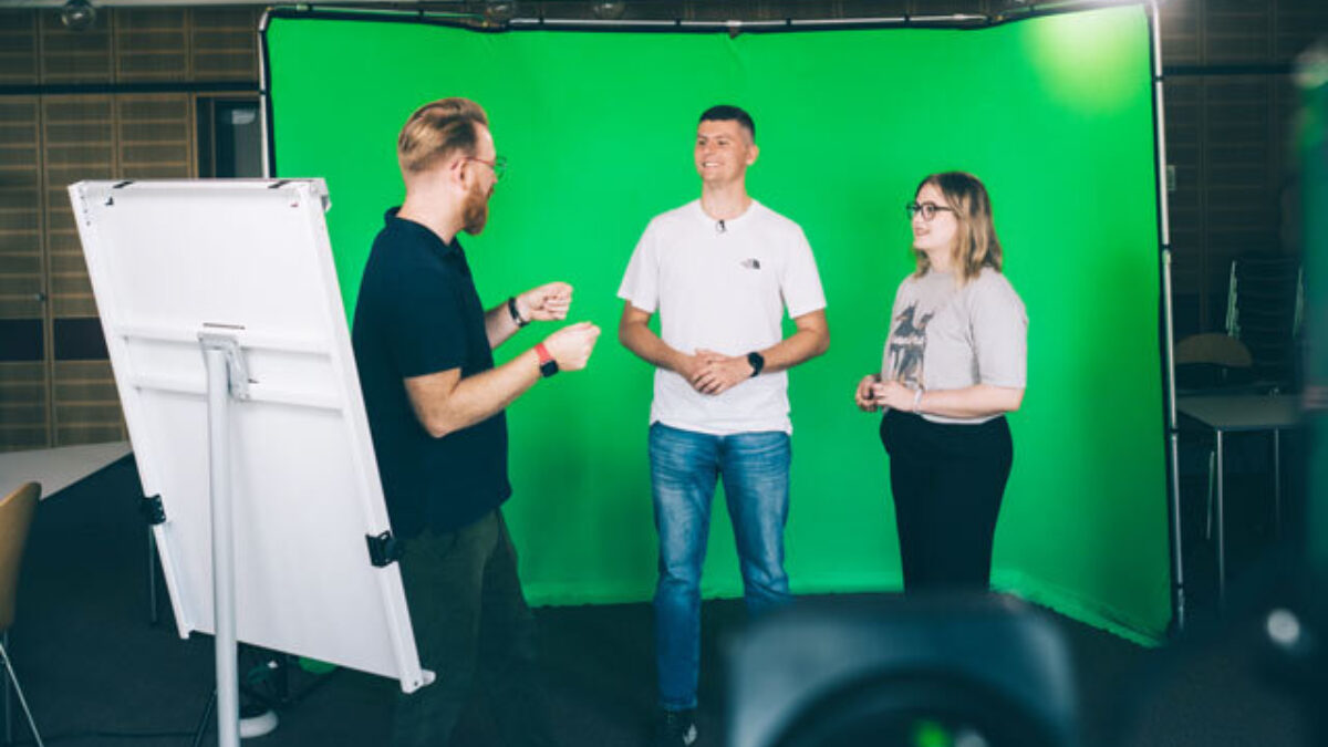 Letzte Tipps vor dem Greenscreen: Auf dem Hintergrund kann das Team später im Video alles Mögliche einblenden.