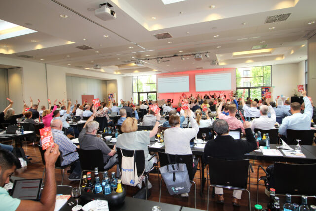 Landesbezirksleiter Roland Strasser (LBDK, oben) weiß um die Bedeutung der Industriepolitik, die auf der Landesbezirksdelegiertenkonferenz (unten) das beherrschende Thema war.