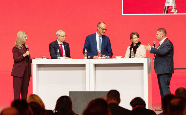 Merz: Wir wissen, vor welchen Herausforderungen wir stehen. Wenn wir jetzt in der politischen Mitte zusammenstehen und zeigen, dass Sozialpartnerschaft und Demokratie funktionieren, dann strafen wir all diejenigen Lügen, die behaupten, unsere Demokratie und unser Land funktionierten nicht mehr. Ich mache diesen Job nicht für einen Titel. Ich mache ihn, damit unsere Kinder und Enkelkinder in einigen Jahren zurückblickend sagen: „Das waren schwierige Jahre, aber die Verantwortlichen in Politik, Unternehmen und Gewerkschaften haben im Grundsatz die richtigen Entscheidungen getroffen. Dadurch kann auch die nächste Generation in Freiheit, Frieden und wirtschaftlicher Prosperität leben.“ Das treibt mich an.