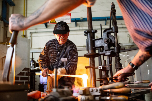 „Soviel wir wissen, sind wir in Europa die einzigen, die eine Vorführung am Halbautomaten bieten“, sagt Torsten Fiedler. Die Maschine ersetzte ab den 1920er-Jahren das Mundblasen durch Druckluft.
