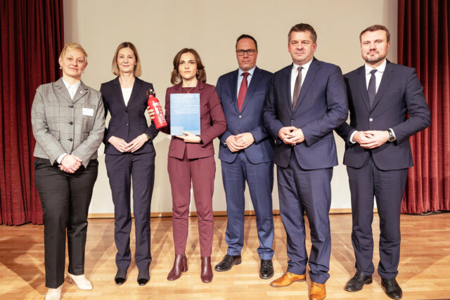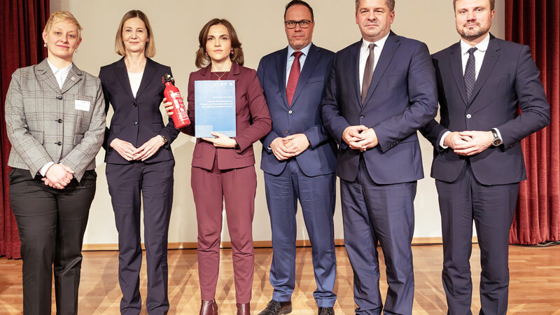 Ein Raunen ging durch die Reihen, als Elisabeth Kaiser, Ostbeauftragte der Bundesregierung, den Feuerlöscher entgegennahm. Die Sozialpartner übergaben ihn ihr auf dem Chemiegipfel in Böhlen am 15. Dezember und hatten dadurch auch im wahrsten Sinne ganz handfest deutlich gemacht, wie ernst die Lage ist. „Die Hütte brennt“, sagte Stephanie Albrecht-Suliak, IGBCE-Landesbezirksleiterin Nordost. „Der Feuerlöscher ist das Symbol für eine Situation, die kein weiteres Zögern erlaubt. Wenn die Hütte brennt, diskutiert man nicht über Zuständigkeiten. Man löscht. Jetzt!“ Zuvor hatten der Verband der Chemischen Industrie, der Landesverband Nordost, der Arbeitgeberverband und die IGBCE Nordost Kaiser eine gemeinsame Erklärung übergeben.