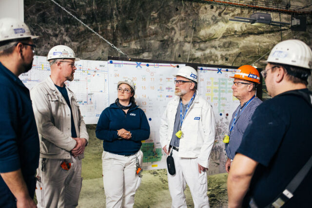 Carolin Günther im Gespräch mit Bergleuten im Revier 11 Südost, darunter die Betriebsräte Stefan Böck (Dritter von rechts) und André Bahn (Zweiter von rechts).
