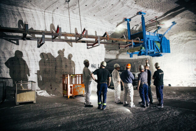 „Das ist ein Naturprodukt“, sagt Stefan Böck. Zugelassen sei das fertige Produkt auch im Öko-Landbau, ergänzt er. Der Abbau folgt einem Gewinnungszyklus: Am Ende jeder der drei Schichten, wenn alle Kumpel oben angekommen sind, wird gesprengt. Die nächste Schicht fährt dann ein, die abgesprengten Salzstücke werden zu den Kippstellen gebracht, wo sie zerkleinert und über Förderbänder in die oberirdische Fabrik gebracht werden, um sie dort weiterzuverarbeiten.