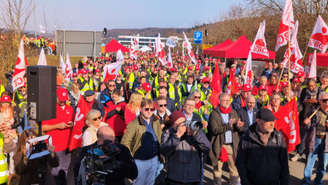 Ein buntes Meer aus Fahnen und Transparenten, dazu der Lärm von Trillerpfeifen und Ratschen: Die Hauptzufahrt zum Standort Behringwerke in Marburg, Werksteil Görzhausen, war am 4. März für mehrere Stunden dicht. Mehr als 3.000 Menschen haben dort ab 12:05 Uhr auf Aufruf der IGBCE demonstriert. Sie wehren sich gegen den permanenten Stellenabbau der Arbeitgeber am Standort. Innerhalb von acht Monaten haben sie mehr als 1.000 Arbeitsplätze vernichtet, und nun sollen Hunderte folgen.