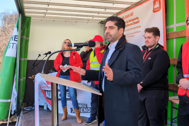 Aus Wiesbaden war der hessische Wirtschaftsminister und stellvertretende Ministerpräsident Kaweh Mansoori gekommen. Eine Reihe von Beschäftigten trat bei der Demo ans Mikrofon: Mitglieder von Betriebsräten, Jugend- und Auszubildendenvertretungen (JAV) und IGBCE-Vertrauensleute.