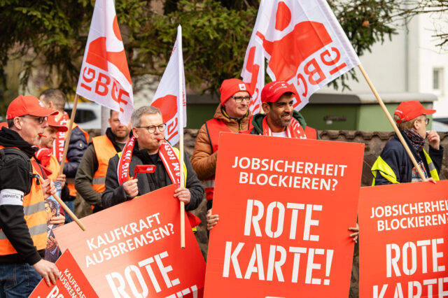 Rund 150 IGBCE-Beschäftigte aus den Bezirken Ludwigshafen und Mittelrhein zeigten der Arbeitgeberseite zum Auftakt der dritten Tarifrunde lautstark die „Rote Karte“.